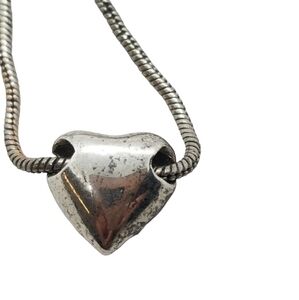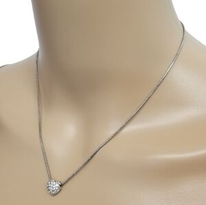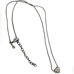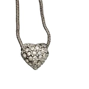 Lovely vintage necklace by Premier Designs features a sterling silver heart pendant with pave crystal detail on a silver plated snake chain. Necklace measures 16-1/2 inches in total length with a spring clasp closure and Premier Designs charm tag near clasp.