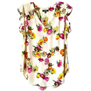 PREMISE | Nude Cream Floral Ruffled Cap Sleeves V-Neck Top Size L