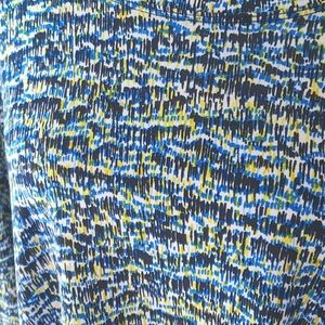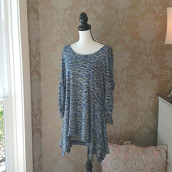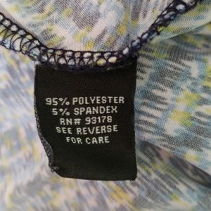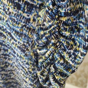 3/4 sleeve scoop neck long on sides top. Has cute gathering at the arms. fun multi colored.