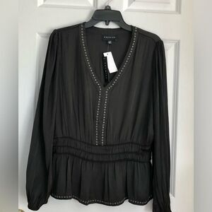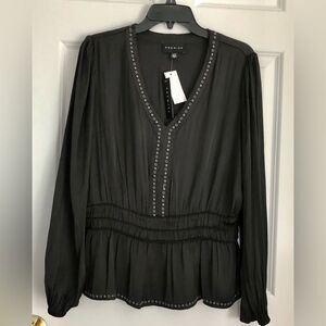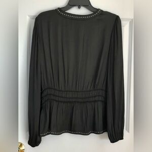 PREMISE WOMEN'S TOP SIZE LARGE BLACK SOLID PULLOVER EMBROIDERED V-NECK LOG SLEEVE PEPLUM TOP LIGHTWEIGHT SOFT