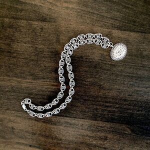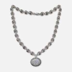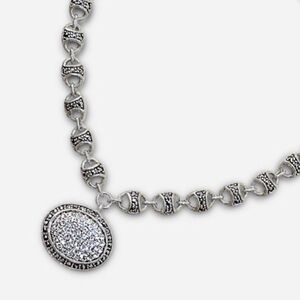 Sparkling endlessly, glittering marcasites encircle a dazzling oval field of pave cubic zirconia and nestle into each link of this iconic chain. Substantial in weight and beautifully crafted, this pendant necklace is fashioned from premium Thai Silver. Although similar to sterling, Thai silver usually has a higher silver content, closer to 99% vs. sterling’s 92%. A fabulous statement piece!