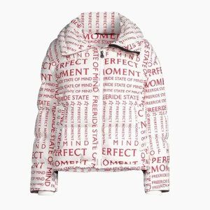 PERFECT MOMENT Performance Ski State Duvet Puffer size medium. Pre-owned in perfect condition puffer from the Performance Ski Collection of Perfect Moment. Cropped down puffer jacket with large contrast text and star patterning. Spread collar and drop shoulders. Long sleeves with banded rib cuffs. Zip front with front welt pockets. Filling is 90/10 goose/down fill and lining is 100% polyester. Machine wash. Originally retails for $650. No size tag, but is a US size large and measures 23" pit to pit. Has been professionally dry cleaned, so ready to wear.