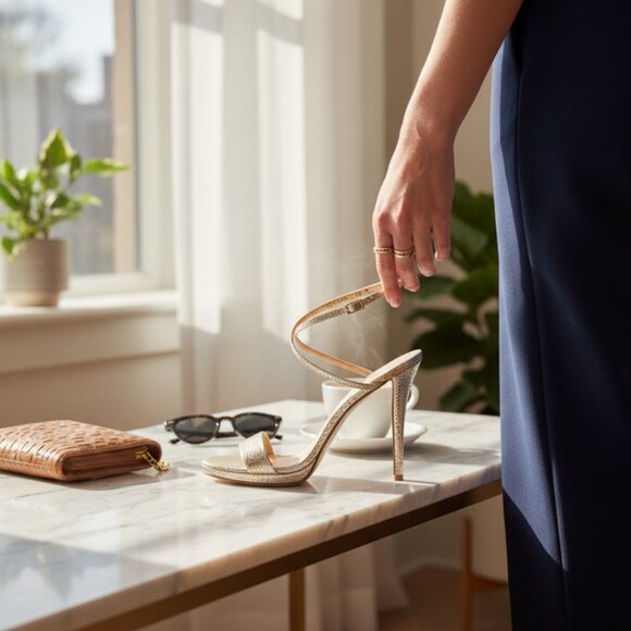 PRE-OWNED DESIGNER STUART WEITZMAN GOLD METALLIC LEATHER ANLE STRAP SANDALS 8.5