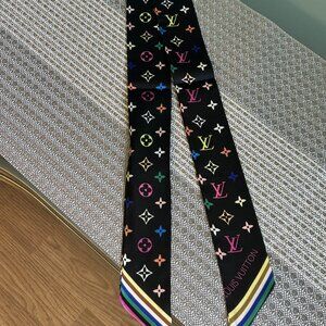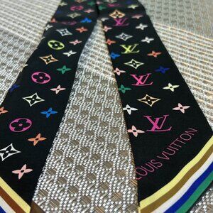 Add a pop of luxury to your look with this stunning Louis Vuitton multicolor monogram silk bandeau. Featuring the iconic LV monogram pattern in vibrant rainbow tones against a sleek black background, this piece is perfect for styling as a neck scarf, handbag accessory, or headband. Made from 100% silk with striped ends for a chic finish. A timeless and versatile designer accent that elevates any outfit.