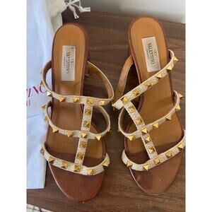This is an authentic pair of VALENTINO GARAVANI Raffia Calfskin Rockstud Mule Sandals size 37.5 in Brown. These strappy sandals are crafted of calfskin leather in brown. They feature a 2.5 inch wedge heel and signature brass pyramid studs on the leather straps. These heel radiate elegance for a look of classic chic, from Valentino