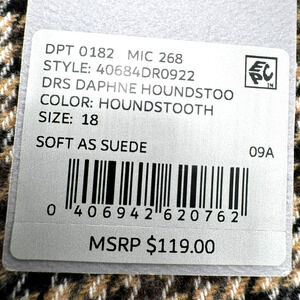 The Preston & York NWT Size 18 Brown Tan Houndstooth Midi Dress is a stylish and versatile piece perfect for various occasions. This dress features a flattering houndstooth pattern, a scoop neckline, and 3/4 sleeves. With wool pockets adding a touch of sophistication, this dress is both fashion-forward and practical. Made with a blend of polyester, nylon, rayon, wool, and acrylic, this tweed fabric dress is machine washable for easy care. Ideal for workwear or a formal event, this dress is a timeless addition to any wardrobe.
