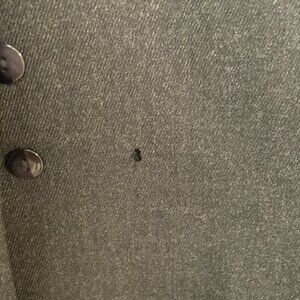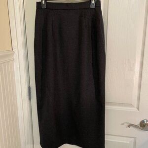 Vintage Preston & York long A-line skirt in slate grey, size 10. Skirt is 100% pure wool. Fully lined. Back kick vent is approximately 19 inches long and has 9 buttons with buttonholes to control opening. There is a small moth hole at the bottom back as seen in pictures. Not noticeable when wearing because of lining. Price for this beautiful wool skirt reflects the small hole.