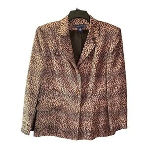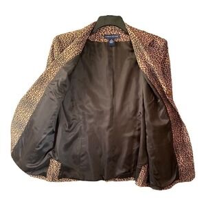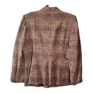 Elevate your look with this stunning silk blazer from Preston & York. The brown leopard pattern adds a touch of boldness to your outfit while the slim fit design flatters your figure. The blazer features a faux lapel, three-button sleeve buttons, and four-button front closure.