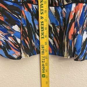 This Top is excellent condition!! The colors are mixed very elegant!! Black, Blues, Pinks and Cream!! Size Medium and it’s 100% polyester!!
