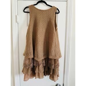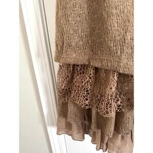 Gently pre-owned. No rips or stains. Very cool and unique dress. Comes with a knit and lace sash (can be worn with it without). Tiered layered multi-material skirt. Can be worn as a dress of long tunic. Soft knit.