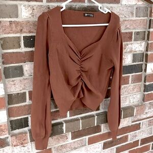 New without tags. Pretty Garden medium brown sweetheart neckline cropped length long sleeve sweater with pretty shirred front. Sweater is very stretchy. 50% viscose, 28% nylon, 22% polyester. size M.