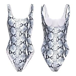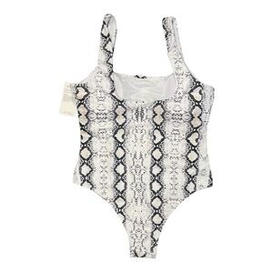 PRETTY GARDEN, NWT, WOMENS PYTHON, HIGH CUT, LOW BACK, SEXY SNAKESKIN PRINT SWIMSUIT, BODYSUIT. 82% NYLON, 18% SPANDEX. SIZE L