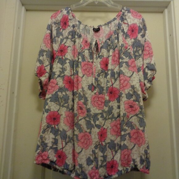 PRETTY GIRL SWEET GIRL TORRID BIG PINK FLOWERS RAYON BLOUSE TORRID 2. THIS IS SUCH A NICE PIECE. IT IS RAYON. IT WAS MADE IN VIETNAM. THERE ARE TIES AROUND THE NECKLINE. THERE IS ELASTIC AROUND THE SHORT SLEEVES AND THE BOTTOM OF THE BLOUSE. ALL THE WAY AROUND THE BLOUSE FROM UNDERARM TO UNDERARM IS 54 INCHES. WITH SOME WEAR YET PLENTY TO SHARE WITH YOU LUCKY BUYER. ENJOY PRETTY DRESSING. 6TH GROUP. # 50. ALSO EB. THANKS.
