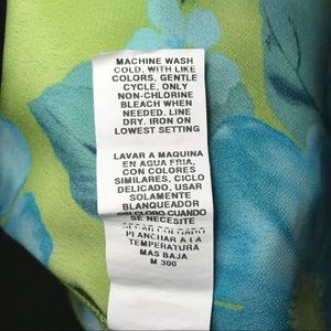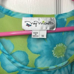 Very pretty light-weight flowered dress will be a fashion hit at that special event!! Blues and greens with a diagonal ruffled hem. Ties at shoulders. Excellent condition/like new. She will love this!!