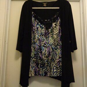 PRETTY LADY CONNECTED TOP & SWEATER SUSAN LAWRENCE WOMAN BLOUSE W LACE 3 X. BLOUSE AND SWEATER TOGETHER CONNECTED. IT WAS MADE IN VIETNAM. IT IS POLYESTER AND SPANDEX. WITH SOME WEAR YET PLENTY TO SHARE WITH YOU LUCKY BUYER. ENJOY PRETTY THINGS. 5TH GROUP. #229. THANKS ALSO EB.