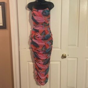 “PRETTY LITTLE THING” Ruched Tropical Pointed Bandeau Midaxi Dress