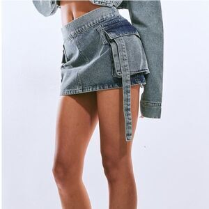 Be the center of the attention with the vintage wash cargo pocket denim mini skirt.