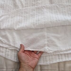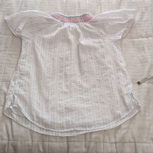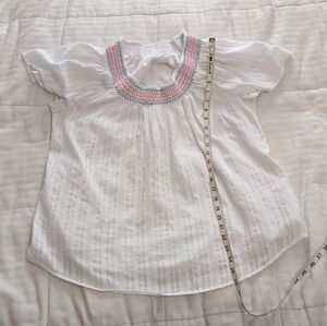pretty classic white peasant top with elastic collar. I don't know the brand or the size but I've included the measurements in the pictures. this is in excellent condition and it's so cute and classic. there are two layers to the shirt so the body of the shirt is not see-through however the sleeves are a little because they're only single layer. classic pink and purple Chevron embroidery around the neckline which is elastic if you want to wear it around your shoulders