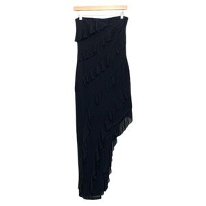 Chic strapless dress with cascading ruffles. Perfect for evening events.