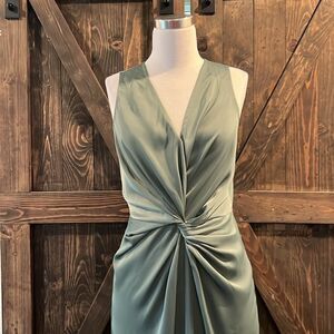 PRETTYGARDEN Satin Ruched Bodycon Dress Twist Front V Neck Sleeveless Split Maxi