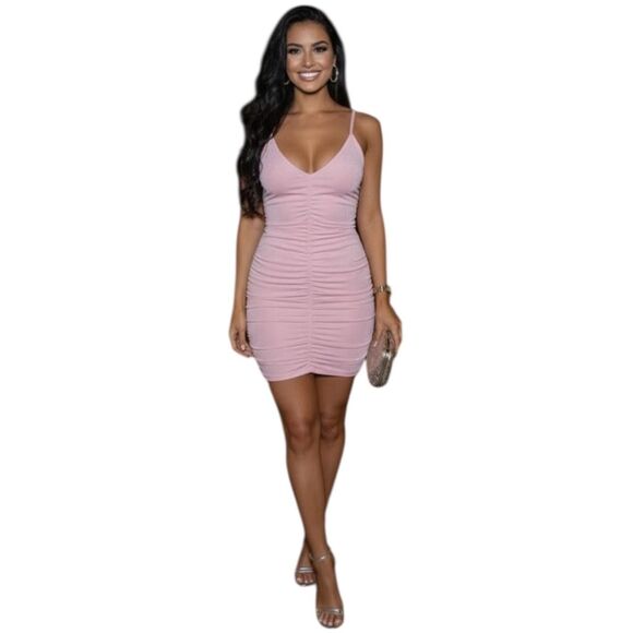 PRETTYLITTLETHING Dress Womens US 2 Pink Ruched Bodycon Mini Party Club V Neck