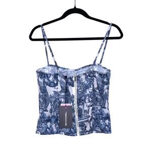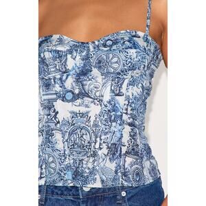 PRETTYLITTLETHING NEW Structured Corset Top Blue Renaissance Print Casual Women's 2