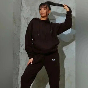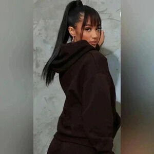 PRETTYLITTLETHING PETITE CHOCOLATE BADGE DETAIL OVERSIZED HOODIE