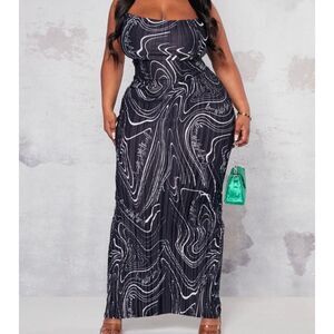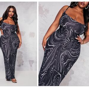 PRETTYLITTLETHING PLUS BLACK WHITE SWIRL PRINTED PLISSE COWL NECK MAXI DRESS
