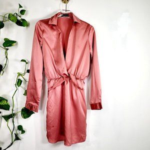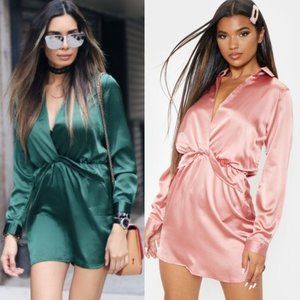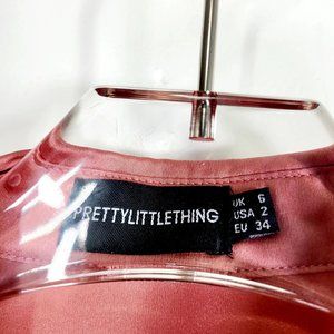 PRETTYLITTLETHING Red Shirt Dress 2 XS Long Sleeve Poplin Twist Front Katalea Features - Side Vents - Collared - Satin Glossy - Slip On - Lightweight - Basic Solid Minimal - Plunge Neckline - 100% Polyester - Twist Front Katalea - Long Sleeve