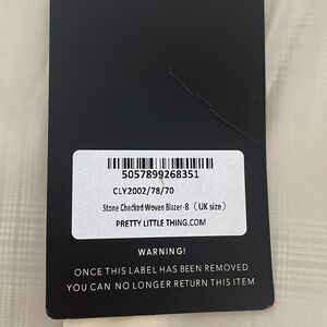 New with tags! PrettyLittleThing stone checked woven loose fit blazer. Tailor up your look with this simple woven blazer. Featuring a stone checked print woven material with a classic collar design and a button-up front. Lined with thin shoulder pads.