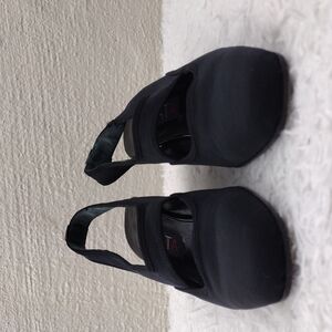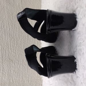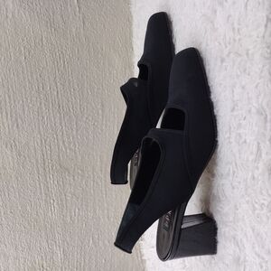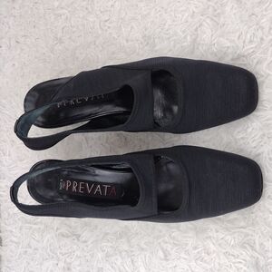 Prevata Made In Italy Women's Black Leather Fabric Cut Out Upper Square Patent Leather Block Heel Slip On Slingback Casual Shoe. Leather Sole. Leather Footbed. Crease/Spot Footbed/Lining. Sole Staining. Minimal Heel Pad Wear. Measurement approx. Heel: 2". Size 5.5B