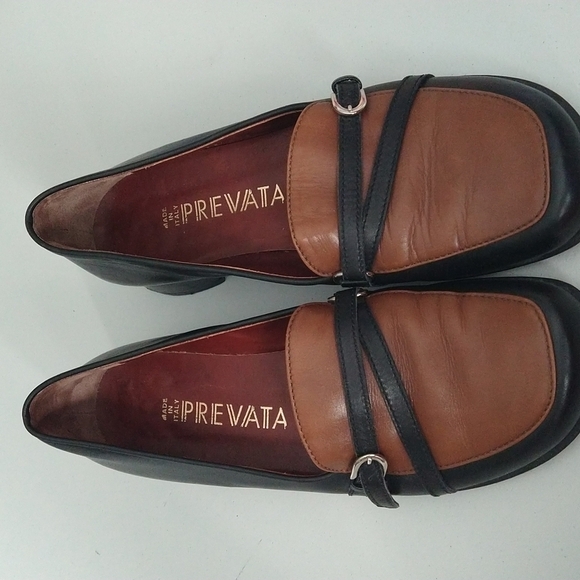 Prevata womans 7 made in Italy flats cross attached buckle across closed toe. Slip on low heeled dress shoes in excellent condition. square toe