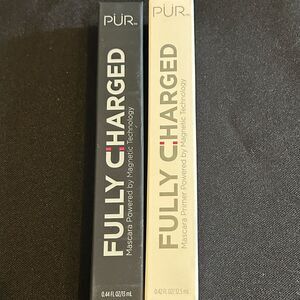 PÜR Fully Charged Mascara and Primer set. Includes mascara and primer powered by magnetic technology. Sleek black and cream packaging.