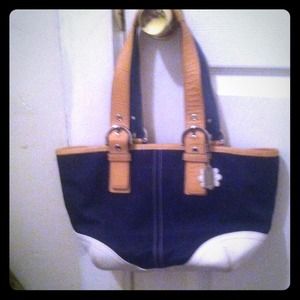 Authentic like new coach bag excellent condition ! Blue, tan & white with Daisy key chain & metal coach tag . One small stain on handle as seen in pic 4 . $60 OBO No trades