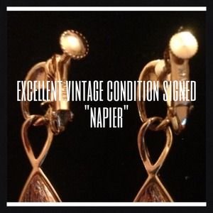 Gold metal alloy & blush pink enamel. 2" Drop, Clip on screw back earrings. Excellent vintage condition. Napier manufactured by Napier Company from 1920-1980, before it was sold to Victoria&Co, which shut down in 1999. Napier jewelry is known for being a fine example of vintage jewelry. Napier considered their jewelry well above the conventional costume jewelry. Napier considered you would be wearing vintage fashion jewelry, fine pieces that you can show off at parties/social gatherings.