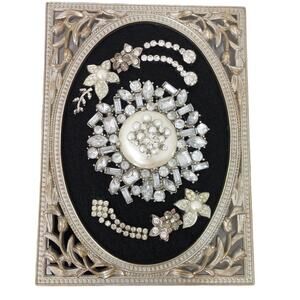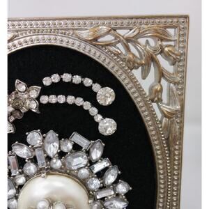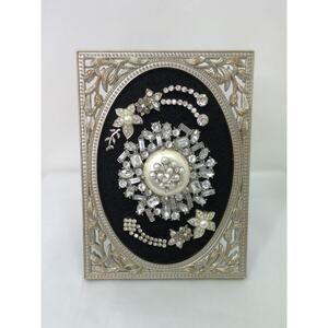 This is a beautiful piece of handmade art and a real collectible. The metal filigree frame measures 5 by 7 inches, is very sturdy, and has an easel back. The vintage rhinestones and beadwork design is exquisite, Reposhing this item I purchased from @whimsical_cache. I have loved having it on my bedroom dresser, but I have two other similar pieces and need to clear some space!