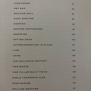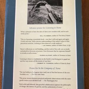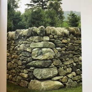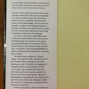 As described on amazon: A master craftsman provides us with the timeless wisdom he has gained from heaving and hewing stone. Vermonter Dan Snow once again proves that he is not just one of America's premier artisans, but also one of our most articulate voices on the natural world and our relationship to it. Snow's medium is stone: He is the nation's premier drystone wall builder. Schooled in this ancient craft, he painstakingly creates structures as breathtaking as sculpture with nothing but gravity as their glue. In Listening to Stone, Peter Mauss's tactile photographs of Snow's artistry are matched by the artisan's quietly compelling prose. Snow demonstrates astonishing range as he touches on such subjects as geology, philosophy, and community. We learn that stone's grace comes from its unique characteristics—its capacity to give, its surprising fluidity, its ability to demand respect, and its role as a steadying force in nature. In these fast-paced times, Snow’s life's work offers an antidote: the luxury of patience, the bounty and quietude of nature, the satisfaction of sweat. "I work with stone," he ultimately tells us, "because stone is so much work."