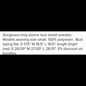 This is the prettiest shirt, and goes perfectly with my Infinity Raine Leggings. See pic 4 for measurements. Check the photos to see the detailing in this shirt. This sweater/shirt is not see through.