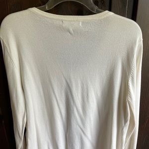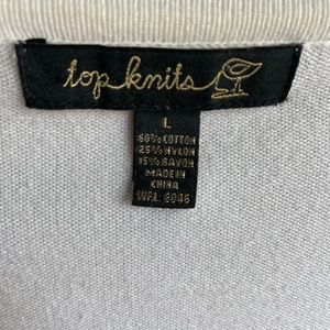 This soft cardigan style sweater is perfect for summer evenings! 60% Cotton, 25% Nylon, 15%Rayon. Size: Women's Large. Lovingly worn, but still in great shape!