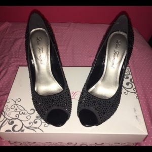 Black shoe with black rhinestones. Only worn once so in a good condition. Height of the heel is about 4 inches!