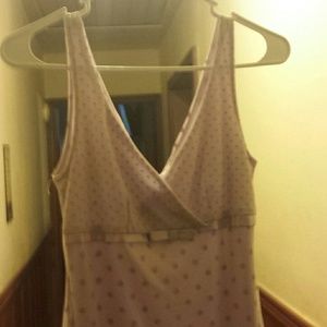 Lavender asymmetrical slip dress with sheer overlay featuring shimmering lavender polka dots and ribbon with bow in front.
