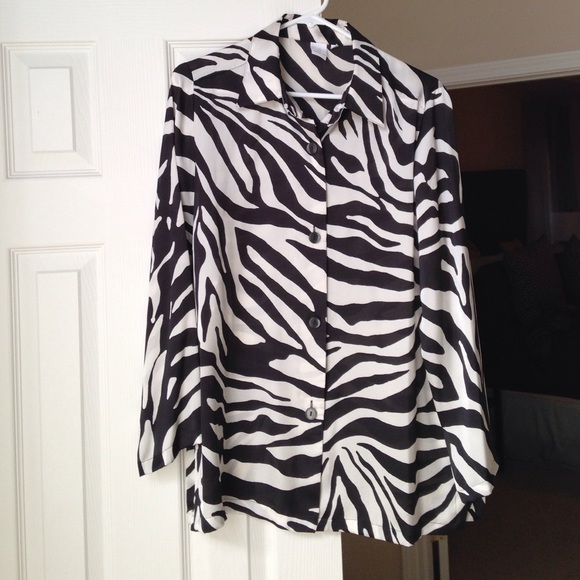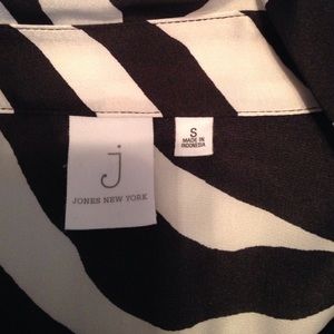 Jones New York size small blouse. Can be worn open with a tank. Or used as a beach cover-up. Simple, wash 'n wear cream/black piece to add to your closet for spring.