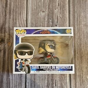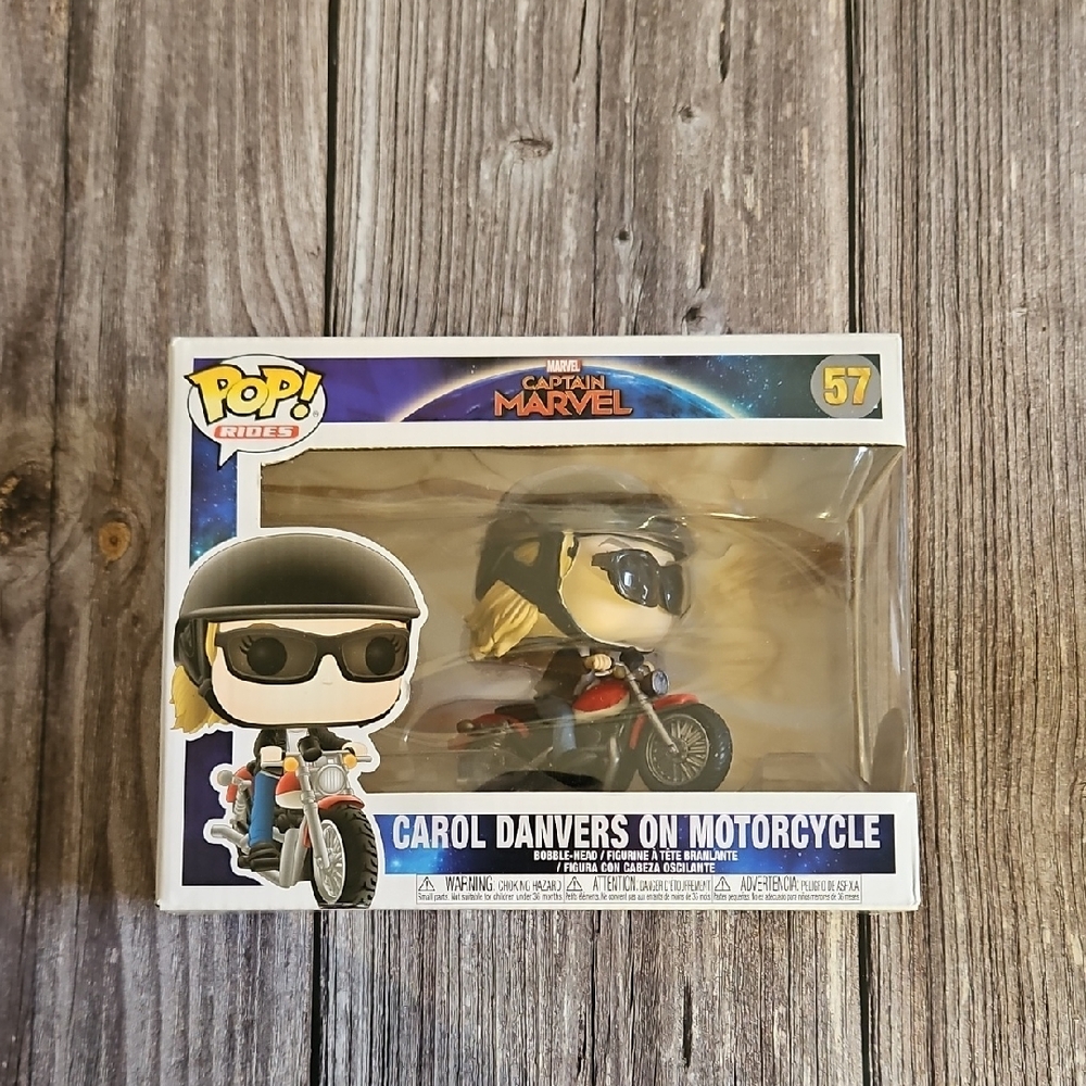 Final markdown! Captain Marvel Pop! Rides figure featuring Carol Danvers on a motorcycle. Vibrant red and black colors. Received new with damage to glasses which can be fixed. See photos for details.