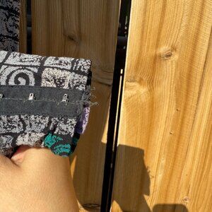 Details- This is a vintage 1980s to 1990s era button down jacket blouse in a primarily grey and black colorway with pops of purple and green. Lightweight with an elasticized bottom. Sleeve cuffs have hook and eyes. Honestly this feels a bit like it might have been part of a dance costume but the material isn’t typical of that.