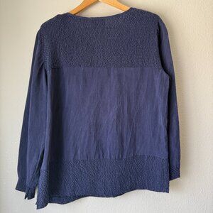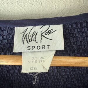 Details- This a vintage 1980s navy silk blouse by Wild Rose. Textures with a single pocket and 3/4 sleeves. Removable shoulder pads.