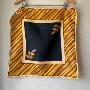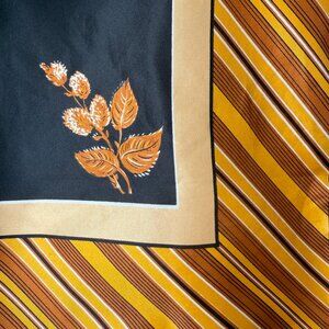 Details- This is a vintage square scarf that features a black center with leaf print and orange, yellow and brown striped edge. I believe it's a polyester. Perfect for tying around the neck for a pop of interest!