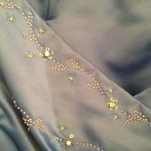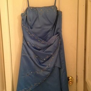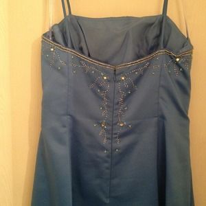 This is a gorgeous prom dress, worn once. It's a lovely shade of blue with light green, blue and silver embellishments that form a flower & vine design. This is a spaghetti strap and is absolutely flattering to any body style.