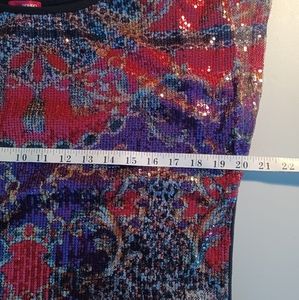 Red and purple sequin top with cap sleeves, solid black back. Tag states Large but seems smaller.PLEASE SEE PHOTOS FOR MEASUREMENTS. EUC no stains, holes, odors. Comes from a non smoking, dog loving home.