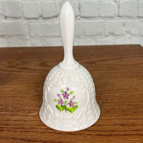 PRICE DROP Fenton Vtg white milk glass bell handpainted, violets in snow