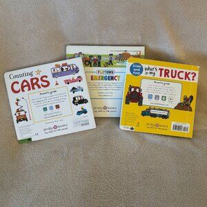 PRIDDY Set of 3 VEHICLE BOARD BOOKS for Toddlers Ages 1+ Years include COUNTING CARS for teaching counting, PLAYTOWN EMERGENCY lift -the-flap book, and WHAT'S IN MY TRUCK? flap and slide book. Like new condition.